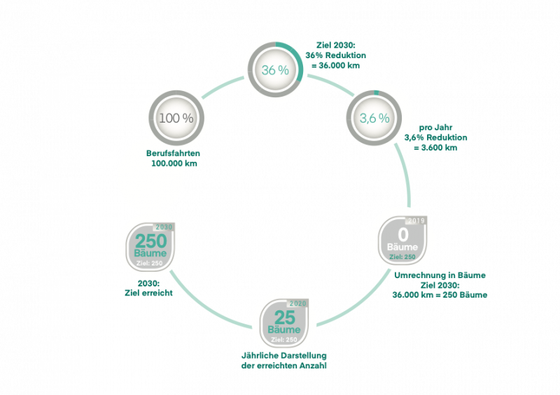 In Bäume gerechnet: Die gesamten 36.000 km sind umgerechnet* 250 Bäume. Die jährliche Reduktion um 3,6 % sind umgerechnet 25 Bäume. Im Jahr 2030 ist das Ziel erreicht.